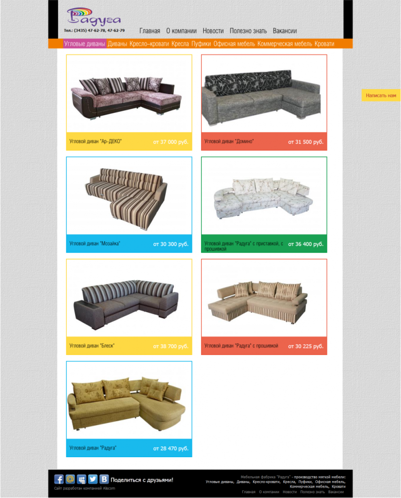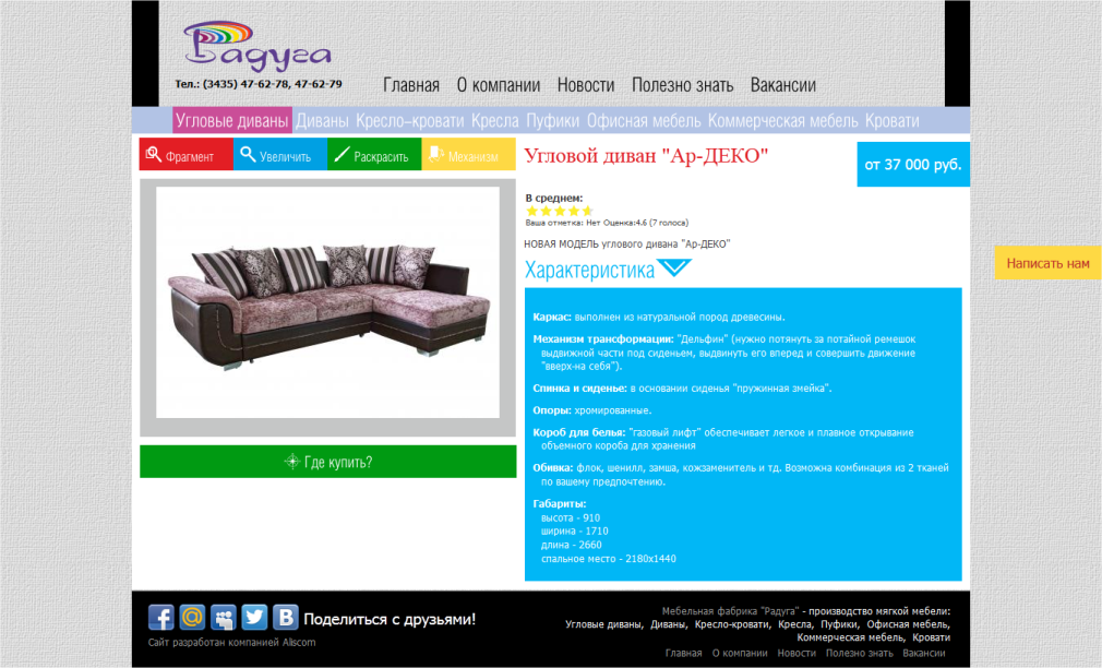 Мебельная фабрика «Радуга» предлагает на продажу мягкую мебель – диваны и кресла, угловые диваны, диван-кровати со склада, а также выполняет производство мягкой мебели под заказ.